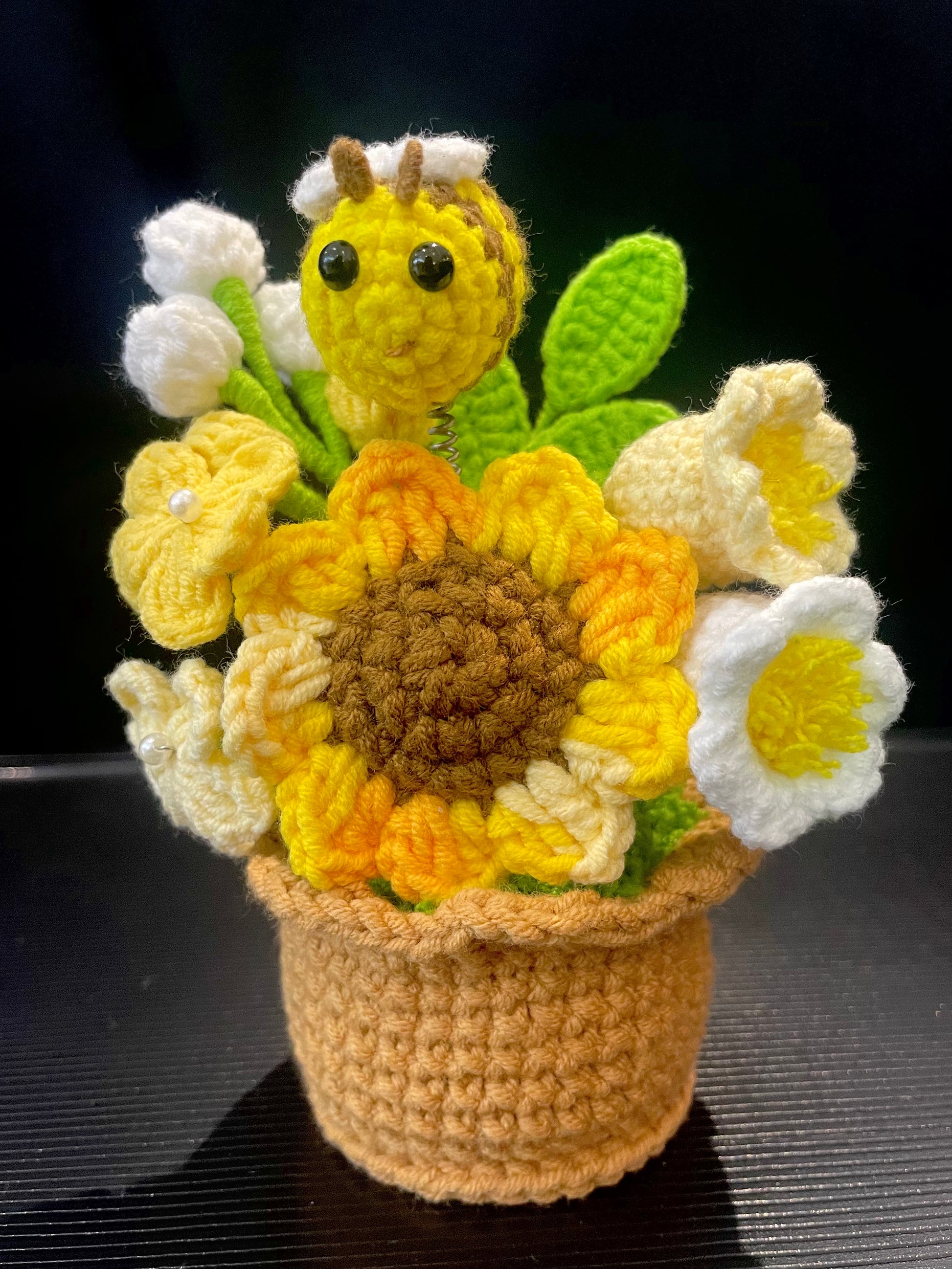 The handmade crochet Flowers & Bee Pot Arrangement captures the sweet charm of a blooming garden in a warm, everlasting form. A cheerful little bee rests among delicate flowers, surrounded by a beautiful combination of sunflower or daisy, baby’s breath, and lily of the valley, creating a lively and heartwarming display full of nature’s gentle beauty.